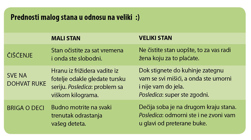 I za kraj, da ne zaboravimo. Naravno, u stanovima postoje i druge prostorije, spavaća soba, dečija soba, ili više njih, pa, na primer, gostinska soba, trpezarija, još jedan salon, ostava, terasa, i tako dalje sve do komšije, ali to bi značilo da vi zapravo nemate mali stan i da ovaj tekst ne čitate jer vas uopšte ne zanima.