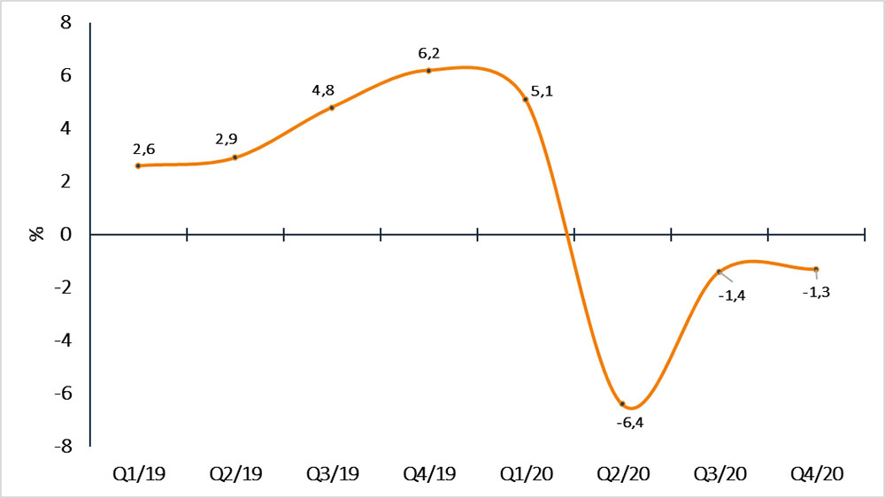 Nakon rasta u prvom kvartalu u iznosu od 5,1% u preostala tri kvartala 2020. godine bruto domaći proizvod Srbije imao je negativne stope rasta u poređenju sa istim kvartalima 2019. godine. Najveći pad BDP-a zabeležen je u drugom kvartalu u iznosu od 6,4%. Nakon toga BDP je rastao, ali je i pored toga zabeležena negativna stopa rasta u poslednjem kvartalu 2020. godine (grafikon 1).