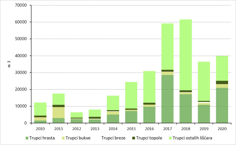 Nakon 2018. godine, kada je dostignut rekordni iznos od 61.581 m3, izvoz trupaca iz Srbije je opao u 2019. godini na nivo od 36.423 m3. Međutim, u 2020. godini izvoz je ponovo nastavio sa rastom i pored problema sa otežanim transportom i povećanim troškovima prevoza zbog pandemije COVID 19. U 2020. godini izvezeno je 39.857 m3 što je predstavljalo povećanje za 9,4% u odnosu na prethodnu godinu. U poslednjih deset godina iz Srbije je izvezeno 300.518 m3 najkvalitetnijih trupaca lišćara (dominantno hrasta) za kojima vlada velika potražnja od strane domaćih drvoprerađivača. Kada se tome dodaju i velike količine rezane građe lišćara koja se takođe izvozi, iako i za njom postoji velika potražnja na domaćem tržištu, onda ne čude podaci koji pokazuju rast uvoza rezane građe hrasta kako bi se podmirile potrebe domaćih preduzeća koja se bave proizvodnjom nameštaja i drugih proizvoda sa visokim stepenom finalizacije.