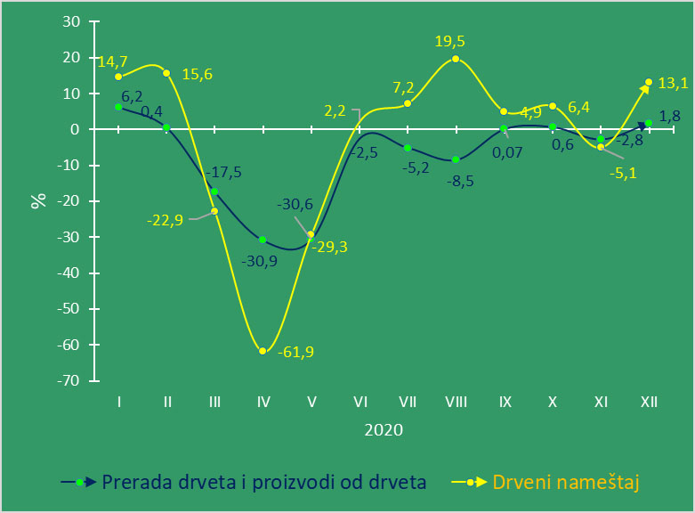 Nakon drastičnog pada u martu i aprilu, izvoz nameštaja od drveta je nakon toga uglavnom beležio rast, sa izuzetkom novembra meseca. Zahvaljujući tome ostvaren je ukupan rast izvoza nameštaja od drveta od 0,9%. Međutim, kada je u pitanju prerada drveta i proizvodi od drveta situacija je potpuno drugačija. Glavni razlog pada izvoza u ovoj grani predstavljao je pad izvoza rezane građe, prozora, vrata i podova od drveta.
