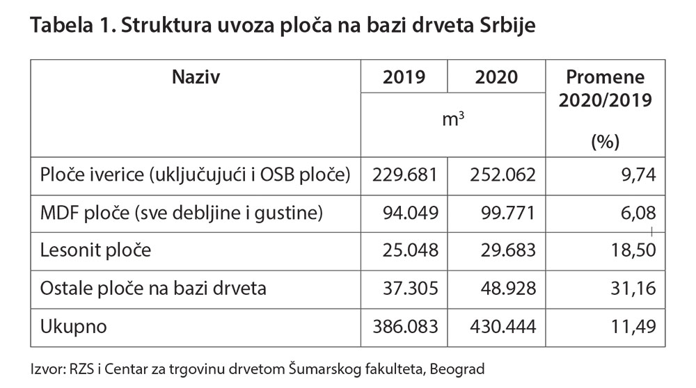Uprkos pandemiji uvoz svih vrsta ploča na bazi drveta je imao izražen rast. U 2020. godini Srbija je uvezla 430.444 m3 ploča na bazi drveta (svih vrsta) u vrednosti od 143,2 miliona US$. U odnosu na prethodnu godinu rast uvoza je iznosio 11,49%. U strukturi uvoza dominantno mesto zauzimale su ploče iverice sa 252 hiljade m3 ili 66,1 milion US$. Uvoz MDF ploča iznosio je 99,8 hiljada m3 u vrednosti od 42,1 milion US$ (tabela 1).