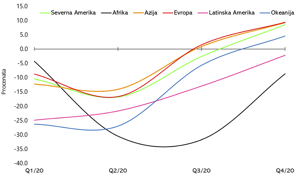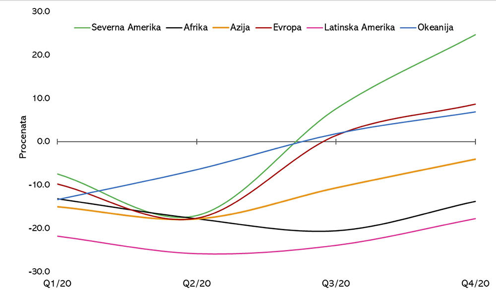 Slika 3. Promene izvoza drveta i proizvoda od drveta po regionima i kvartalima u 2020. godini u poređenju sa istim periodom 2019. godine (Izvor: Kalkulacije autora bazirane na COMTRADE databases)