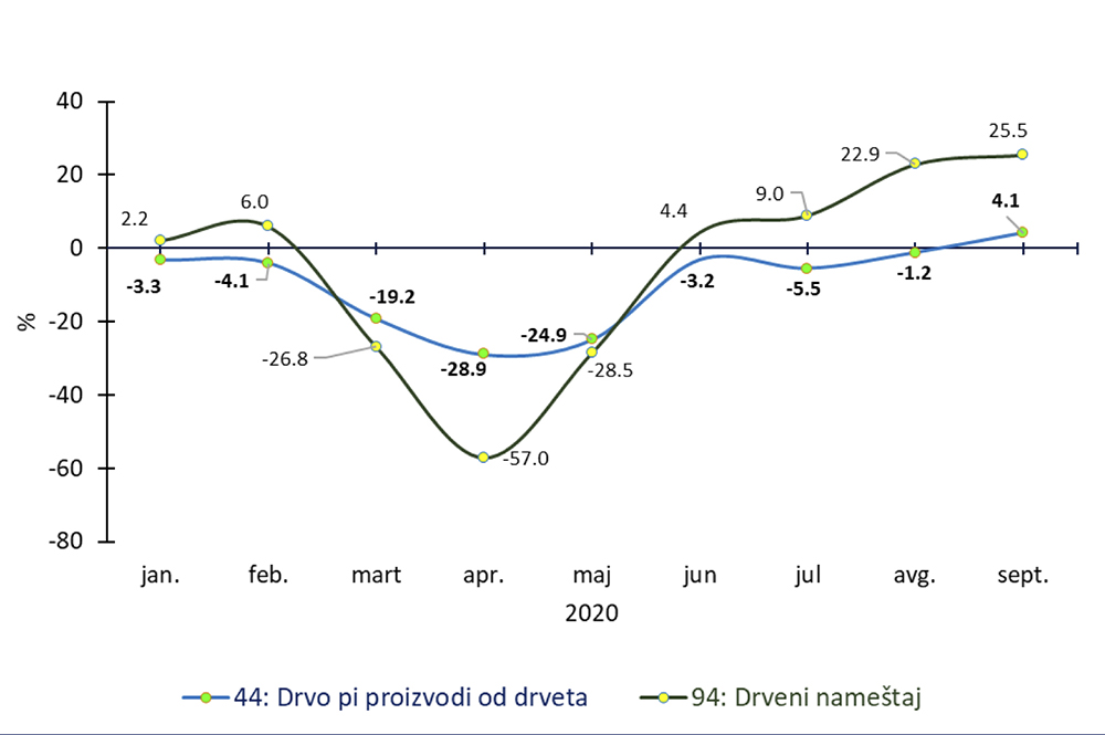 Koliko je bio jak uticaj pandemije COVID-19 na globalnu trgovinu drvetom i proizvodima od drveta najbolje pokazuju podaci o padu izvoza i uvoza po pojedinim kvartalima 2020. Poređenja su rađena u odnosu na iste kvartale 2019. godine. Najveći pad izvoza zabeležen je u drugom kvartalu 2020. godine u iznosu od 16,5%. U prvom i trećem kvartalu 2020. godine zabeležen je takođe pad izvoza od 11,1% i 0,5% respektivno. Jedino je u četvrtom kvartalu ostvaren rast od 8,4% što ukazuje da se globalna trgovina počela oporavljati tek krajem 2020. godine.