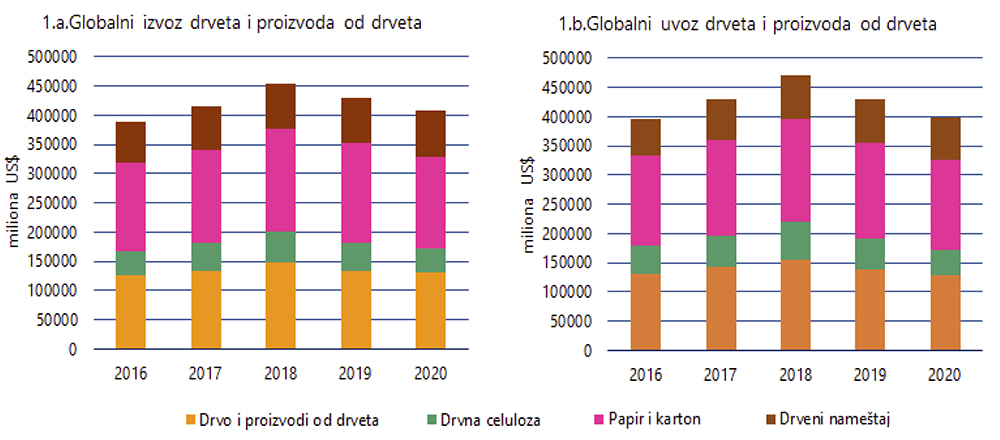 Problemi u globalnoj trgovini drvetom i proizvodima od drveta koji su postojali tokom 2019. godine još više su se produbili sa početkom pandemije COVID-19, posebno u prvoj polovini 2020. godine. Globalni izvoz drveta i proizvoda od drveta u 2020. godini opao je za 5,1% u poređenju sa 2019. godinom, a u odnosu na 2018. godinu, kada je zabeležio najveću vrednost u poslednjih pet godina, njegov pad je iznosio čak 10,4% (slika 1a). Pad uvoza u 2020. bio je još drastičniji u odnosu na izvoz i iznosio je 7,0% (slika1 b).