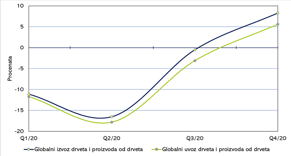 Situacija sa globalnim uvozom je bila još nepovoljnija. Globalni uvoz drveta i proizvoda od drveta je imao pad u prva tri kvartala 2020. godine pri čemu je taj pad bio dvocifren u prvom (-11,7%) i drugom kvartalu (-17,8%). U trećem kvartalu uvoz se blago oporavio i počeo da raste ali ipak to nije bilo dovoljno da se zabeleži rast u poređenju sa istim periodom prethodne godine. Trend rasta uvoza iz trećeg kvartala nastavio se u četvrtom kvartalu, zahvaljujući čemu je zabeležen rast od 5,6% (slika 2).