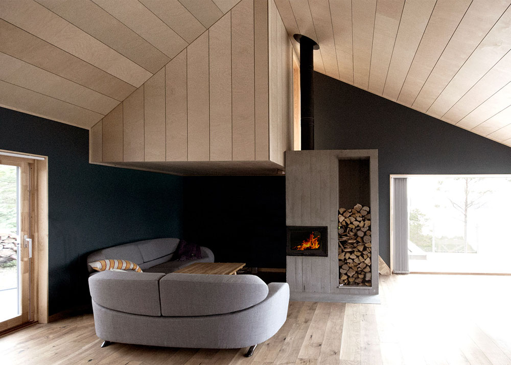 Betonski kamin na kraju dnevne sobe postepeno otpušta toplotu i zajedno sa šperpločom koja oblaže tavan i tamnim zidovima stvara prijatnu atmosferu unutar životnog prostora.