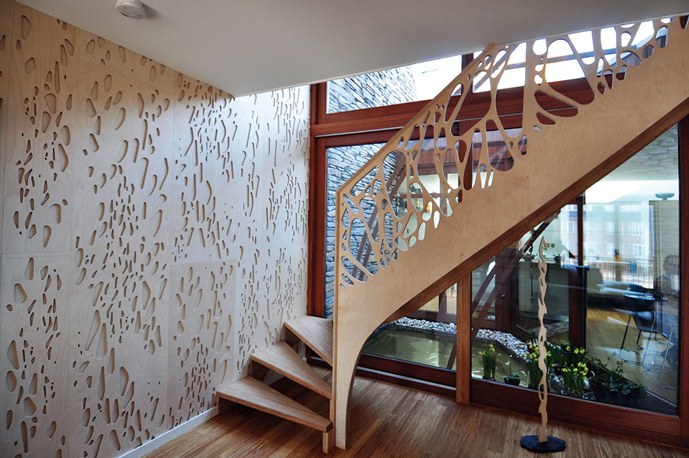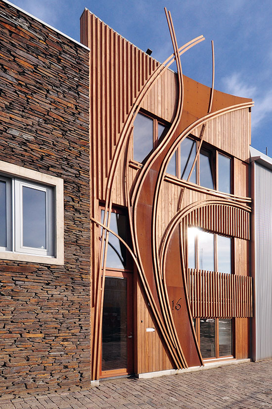 Nepravilna, dekorativna drvena forma se proteže celom visinom objekta, prelazi preko prozora prvog sprata i završava neposredno iznad visine ravnog krova. Severne evropske zemlje odvajkada imaju praksu da za gradnju stambenih objekata koriste prirodne materijale, pre svega drvo. Takav koncept imalo je njihovo tradicionalno graditeljstvo, a u današnje vreme ponovo se intenzivno primenjuje zahvaljujući novim tehnologijama prerade, obrade i pripreme drveta. Proizvođači drvenih fasadnih obloga garantuju dug vek trajanja ovog materijala, naravno ukoliko se fasada pravilno postavi i redovno održava. Drvo koje je upotrebljeno na kući u Nju Lejdenu je tzv. „jatoba” drvo. „Jatoba” drvo je popularan naziv za drvo brazilske trešnje, jedno od najtvrđih egzotičnih vrsta drveta (sa tvrdoćom čak dva puta većom od hrasta), koje se obilato koristi za podne obloge u visokofrekvetnim prostorima. Njegova sve češća primena danas zasnovana je ne samo na povoljnim tehničkim karakteristikama, već i na izuzetnoj lepoti tona i teksture. Virtuoznost i nesvakidašnjost u kompoziciji fasade postavlja ovaj objekat kao remek-delo dizajna, čineći ga svojevrsnom trodimenzionalnom skulpturom nalik na dela koja je na prelazu iz 19. u 20. vek u Španiji stvarao katalonski arhitekata Antonio Gaudi.