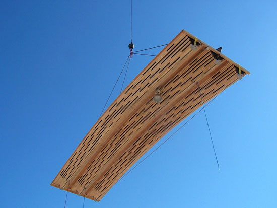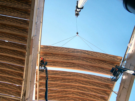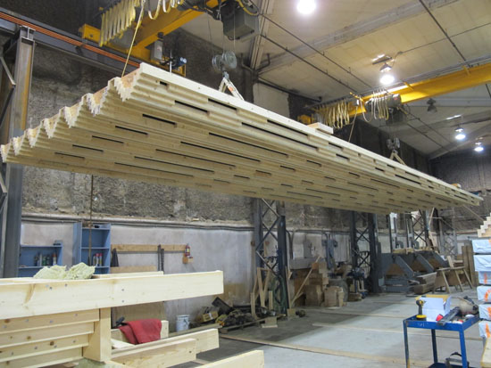 Ovaj novi montažni WoodWave strukturni sistem je razvijen uz korišćenje konvencionalne metode lightframelumber (vrsta ramovske konstrukcije) koja se, u Severnoj Americi, obično koristi u drvenim ramovskim konstrukcijama za velike distance, radije nego konvencionalne metode koje se koriste ekserima i lepkom za izradu lameliranih ploča od masivnog drveta.