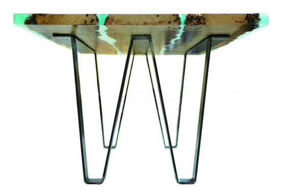 Ovaj zanimljivi sto je napravljen od tri hrastove daske, rezanih na oštro, koje prolaze kroz precizno i mukotrpno pranje, čišćenje, sušenje i procedure dezinfekcije, a na kraju su zaštićene tankim slojem pčelinjeg voska. U ovoj zbirci nameštaja, drvo tzv. brikole, oštećene od morske vode, se sklapaju sa oksidiranim elementima od gvožđa, zatim se kombinuju ili sa staklom ojačanim u nekoj od italijanskih vrhunskih firmi stakala, ili sa različitim zapreminama posebne transparentne smole, kojom je moguće zapuniti sve šupljine i time zaštititi detalje za sva vremena.