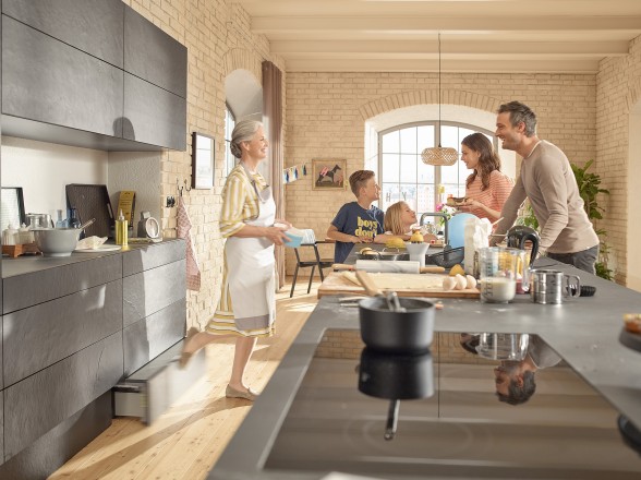 Zahvaljujući Blumovoj tehnologiji kretanja sasvim lako možete otvoriti SPACE STEP rešenje za postolje, na primer sa električnom pomoći pri otvaranju SERVO-DRIVE. Za blago zatvaranje brine se BLUMOTION prigušenje.