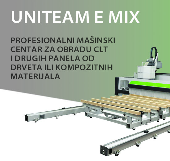 BIESSE ODGOVARA sa tehnološkim rešenjima koja podržavaju i uvećavaju tehničku ekspertizu uporedo sa novim saznanjima o radnim procesima i materijalima koji se koriste. Uniteam E MIX je obradni centar specijalno dizajniran za obradu CLT i drugih tipova kompozitnih panela od drveta velikog gabarita za proizvodnje srednjeg kapaciteta. Jedinstven po fleksibilnosti i konstantan u preciznosti i produktivnosti.