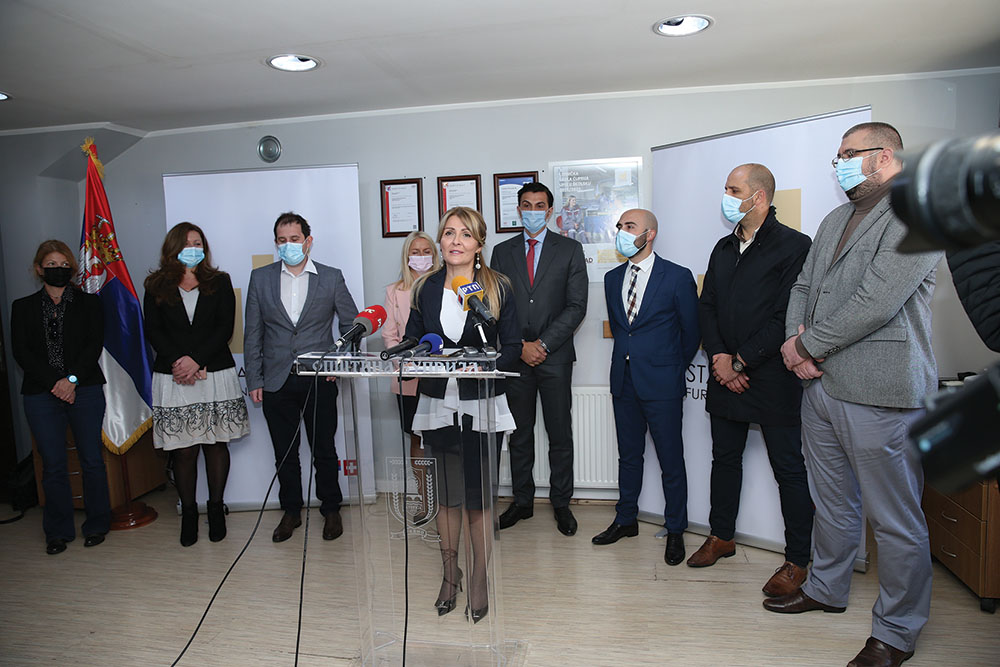 Promocija programa dualnog obrazovanja u kompaniji Standard Furniture Serbia 21.10. 2021. godine - konferencija za medije, za govornicom je prof. dr Gabrijela Grujić, pomoćnica ministra za dualno i preduzetničko obrazovanje i vaspitanje; u drugom redu, s leva na desno: Jovana Mihajlović, iz Švajcarske razvojne agencije; Maja Manić, direktorka Tehničke škole iz Ćuprije; Jovica Antić, predsednik opštine Ćuprija; mr Mirjana Kovačević, rukovodilac Centra za edukaciju, dualno obrazovanje PKS; Edin Dacić, vlasnik kompanije Standard Furniture Serbia; Miodrag Perović, generalni direktor kompanije Standard Furniture Serbia; Vladimir Vasiljević, zamenik predsednika opštine Ćuprija i Đorđe Nešković, član veća za obrazovanje opštine Ćuprija
