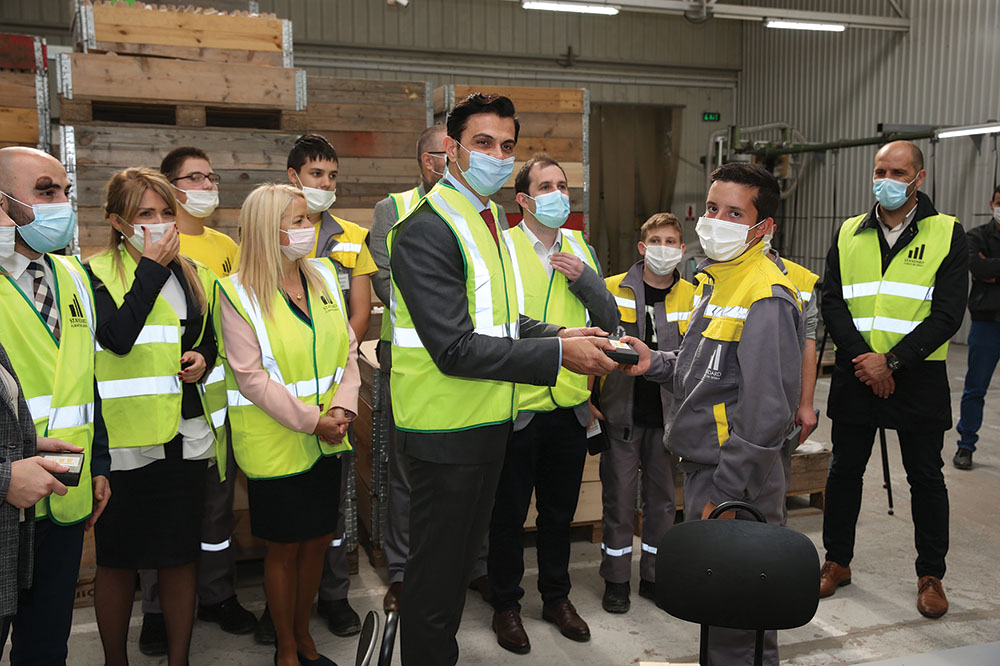 – Oformljeno odeljenje u kome je i 10 učenika, budućih operatera za izradu nameštaja startovalo je u školskoj 2021/22. godini od 1. septembra i od tada oni svakog četvrtka i petka, od 8 do 14 časova, dolaze kod nas u fabriku, a preostala tri dana u školi pohađaju teoretsku nastavu. Kod nas, po Zakonu o dualnom obrazovanju, obavljaju praktični deo nastave uz nadzor licenciranih instruktora. To su naši šefovi proizvodnje, menadžeri koji su prošli obuke Privredne komore Srbije i imaju sertifikat licenciranog instruktora. Uz to, uvek je tu prisutna i profesorka iz škole koja je drvo-prerađivačke struke, a zadužena je za dualno obrazovanje. Za nas je ovo novo iskustvo i lepo funkcioniše. Deca su dobra, stiču navike i obaveze, a mi se maksimalno trudimo da realizujemo planirani program, da ih učimo, adekvatno zaštitimo i uposlimo. Njima je to zanimljivo, posebno što ovde, kod nas imamo širok spektar poslova, od primarne do finalne obrade drveta. Za sada su svi upisani muškarci, mada smo mi tokom kampanje i promocije težili da pokažemo kako se za zanimanja u preradi drveta mogu prijaviti i devojčice, posebno zbog činjenice što su 65% zaposlenih u našoj firmi žene. Očekujemo da se u narednom periodu na naše konkurse prijavi više kandidata među kojima će biti i devojaka, a za školsku 2022/23. godinu, mi smo proširili marketinšku kampanju i opet aplicirali za upis 30 učenika za zanimanja u preradi drveta, pa ćemo sa novim podmlatkom praviti nove i lepe priče – objašnjava generalni direktor Miodrag Perović.
