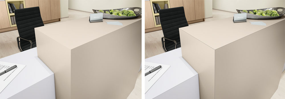 izgleda kao da se sastoji od dve homogene kocke – a taj utisak se do sada mogao postići samo skupom bojom. (Slika levo). Kod korišćenja EGGER laminata bez jezgra u boji naglasak je na spoju kojim se razbija suzdržan homogeni izgled nameštaja.Tako se akcenti mogu postaviti upravo tamo gde ih želimo. (Slika desno).