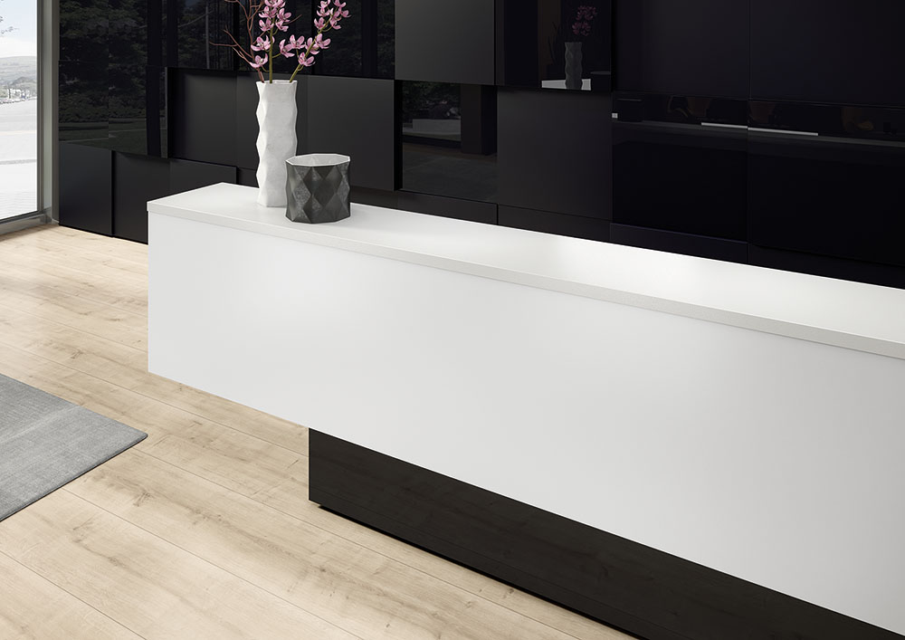 Crno-beli kontrasti su opet u modi. Zidna obloga ove hotelske recepcije je izvedena kao razigrana površina. Uni dekor U999 Crna naročito je upečatljiv sa novim površinama PerfectSense Matt i Gloss, pa zid dobija novu živahnost,iako je zapravo urađen u jednoj boji. Pult od laminata u dekoru W1000 Premium bela sa površinom ST89 Silvretta svojom kristalnom dubinom i sjajem unosi dodatnu taktilnu dimenziju.