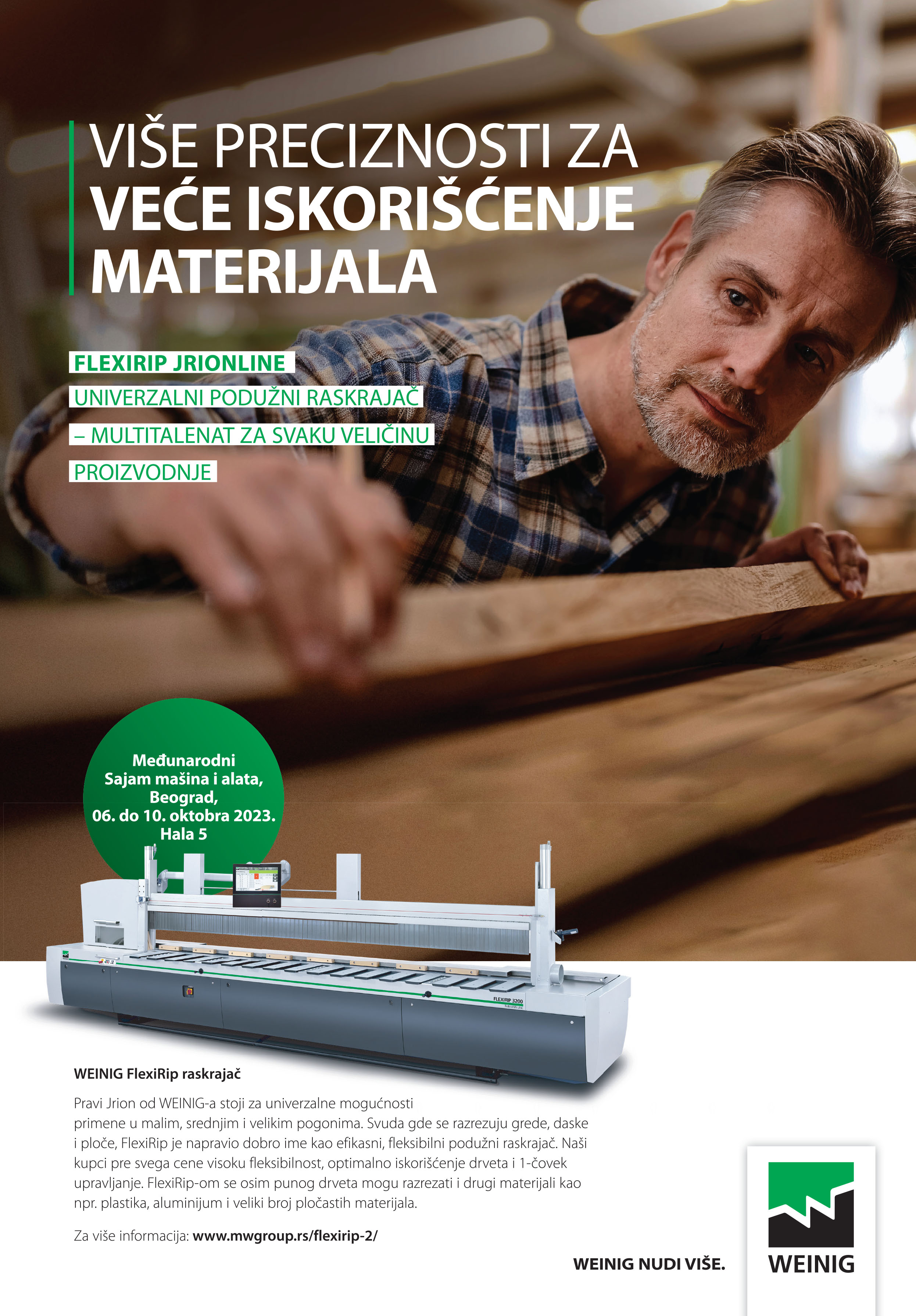 WEINIG FlexiRip raskrajač Pravi Jrion od WEINIG-a stoji za univerzalne mogućnosti primene u malim, srednjim i velikim pogonima. Svuda gde se razrezuju grede, daske i ploče, FlexiRip je napravio dobro ime kao efikasni, fleksibilni podužni raskrajač. Naši kupci pre svega cene visoku fleksibilnost, optimalno iskorišćenje drveta i 1-čovek upravljanje. FlexiRip-om se osim punog drveta mogu razrezati i drugi materijali kao npr. plastika, aluminijum i veliki broj pločastih materijala.