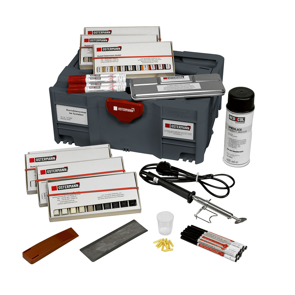 Savet kompanije Ostermann je sistem za korekciju REDOCOL u Systainer-u. Ovde postoje najvažniji alati za reparaciju drvenih površina već spremni za upotrebu i predaju u praktičnom koferu koji možete da ponesete sa sobom do kupca. Pored tvrdog i mekog voska u uobičajenim bojama, naći ćete prave alate za njihovu primenu, kao i flomaster za lak kant trake i lak u spreju za završnu obradu.