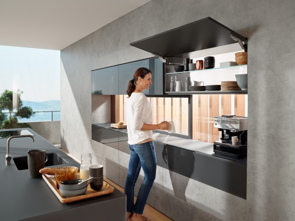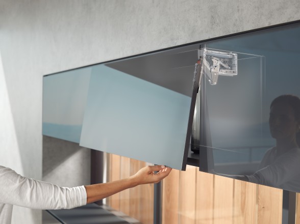 AVENTOS HK top se neprimetno uklapa u visoke ormane i gornje elemente. Za svoj minimalistički dizajn, okov za frontove koji se preklapaju nagore je već osvojio nekoliko nagrada.