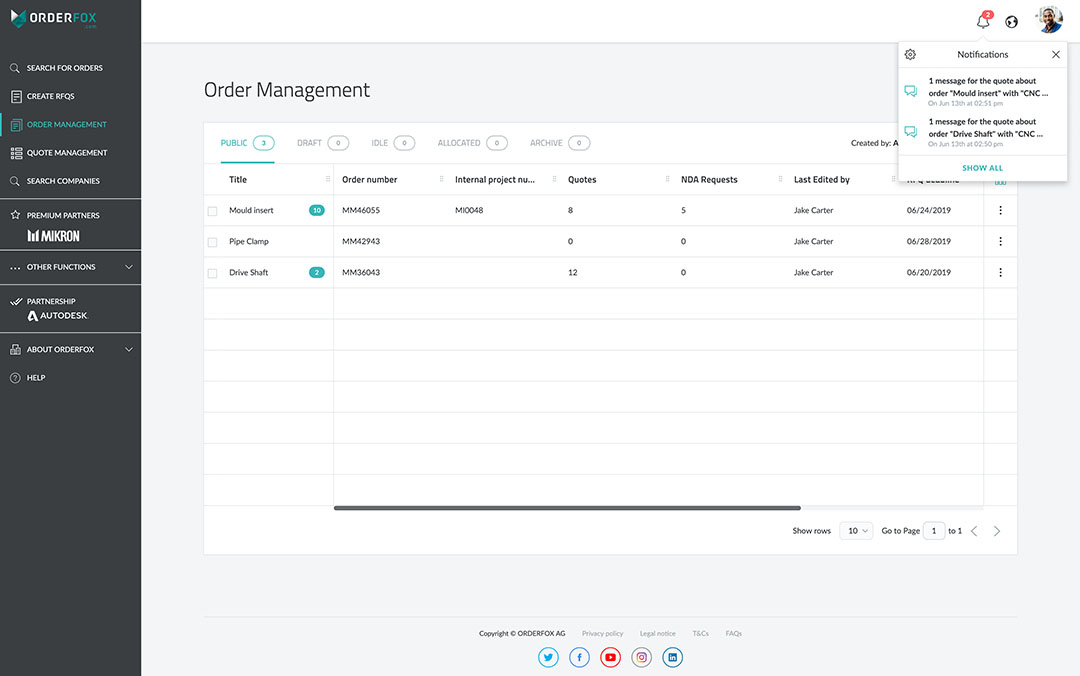 Dodata vrednost za kupce: Sistem za upravljanje narudžbama za potpunu kontrolu svih detalja narudžbi. Na ORDERFOX.com, kupci mogu da zahtevaju i organizuju ponude i komuniciraju na jednom mestu. Sa novim sistemom za upravljanje narudžbama, kupci mogu upravljati potrebnim detaljima i komunicirati brzo i lako sa proizvođačima u vezi otvorenih tema. Koristeći novi Messenger, i kupci i proizvođači imaju direktan pristup jedni drugima u realnom vremenu. Messenger omogućava ne samo direktnu komunikaciju, već i mogućnost učitavanja i preuzimanja datoteka radi lakšeg procesa i povećane efikasnosti. Pored toga, in-app obaveštenja osiguravaju da poruke nikada neće biti izgubljene, pa se oprostite od zloglasne poplave e-mailova! Sada, kupci mogu odmah odgovoriti na trenutne poruke i informacije u bilo koje vreme - a ORDERFOX.com to može učiniti i za njih u određenim situacijama. U okviru ovih novih funkcija ORDERFOX.com, jedna od ključnih prednosti je da platforma može automatski obavestiti sve proizvodne partnere kada je RFQ dodeljen drugoj kompaniji članici, čime se osigurava da su svi članovi 100% ažurirani, uz zadržavanje budućih linija komunikacije otvorenim. Prilagodljive tabele osiguravaju da kupac vidi samo one podatke koji su mu potrebni u njihovom pregledu - na primer, status Ugovora o neotkrivanju (Non-Disclosure Agreement ). Da bi se osigurala veća dodana vrednost, kupci mogu koristiti Crnu listu i Liste ekskluzivnih partnera da bi tačno kontrolisali ko može da vide RFQ, a ko ne.