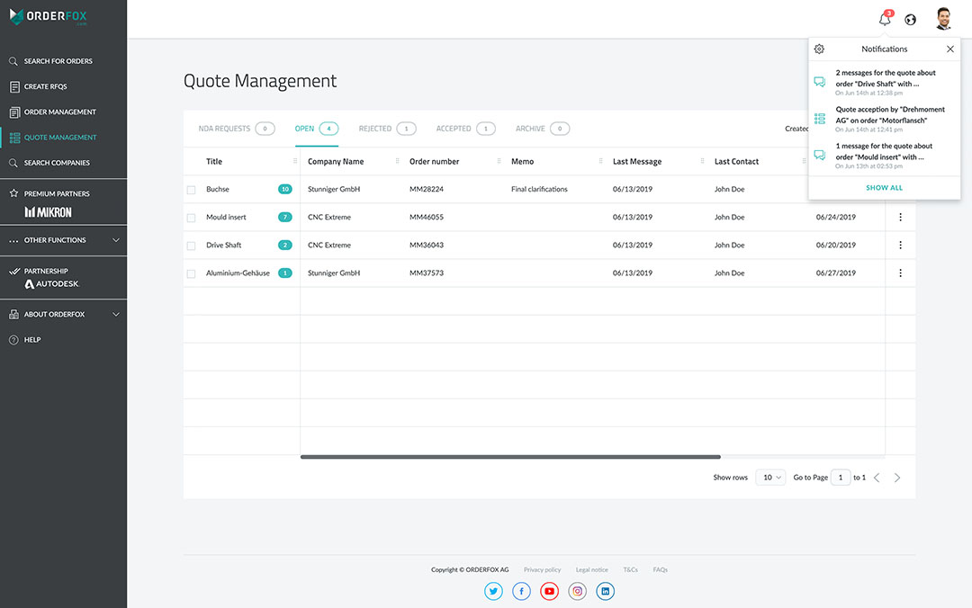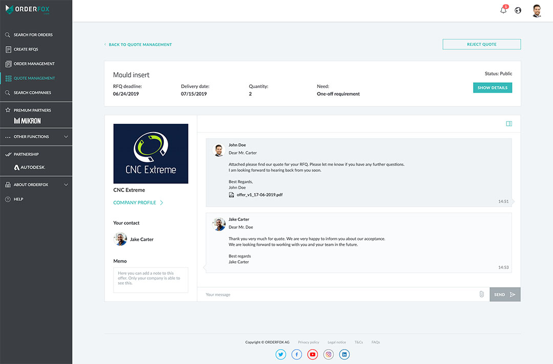 ORDERFOX.com, CNC proizvođači imaju organizovan pregled svih ponuda koje su pružali u svakom trenutku. Nijedan status se ne propušta - bez obzira da li CNC proizvođači rade pojedinačno ili u timovima. Sa in-app obaveštenjima, CNC proizvođači imaju potpunu kontrolu nad svim komunikacijama u svakom trenutku. Messenger omogućava direktnu komunikaciju kupca sa kontakt osobom za pitanja, a ponude se mogu poslati samo jednim klikom - i povući isto tako lako. Kako bi ubrzao proces, ORDERFOX.com šalje automatska obaveštenja kada kupac prihvati ili odbije ponudu. Sa svim dostavljenim ponudama koje se kontrolišu i pregledaju centralno, i korišćenjem prilagodljivih tabela, CNC proizvođači su uvek u mogućnosti da pogledaju najvažnije informacije na prvi pogled. Trenutno više od 12.000 kompanija širom sveta koristi „Internet CNC industrije“. ORDERFOX.com postaje bitan alat koji se integriše u njihove svakodnevne procese. Kompanije svih veličina, od malih i srednjih preduzeća i velikih korporacija, do lidera međunarodnog tržišta, pridružile su se kao verifikovani članovi ORDERFOX.com. „Sa takvim globalnim dometom, svaki registrovani korisnik ima mogućnost da svakodnevno dođe u direktan kontakt sa hiljadama velikih poslovnih partnera, dok značajno poboljšava svoje mogućnosti rasta“, objašnjava direktor ORDERFOX.com Bernd Schuler. „Oni takođe mogu veoma efikasno predstaviti svoju kompaniju čitavoj CNC industriji kroz svoj globalno pristupačan profil kompanije. ORDERFOX.com je najveća svetska CNC prodavnica - i pionir je digitalizacije širom industrije. Kompanije koje sarađuju sa nama automatski postaju aktivni igrači u budućnosti digitalnog CNC-a. ”