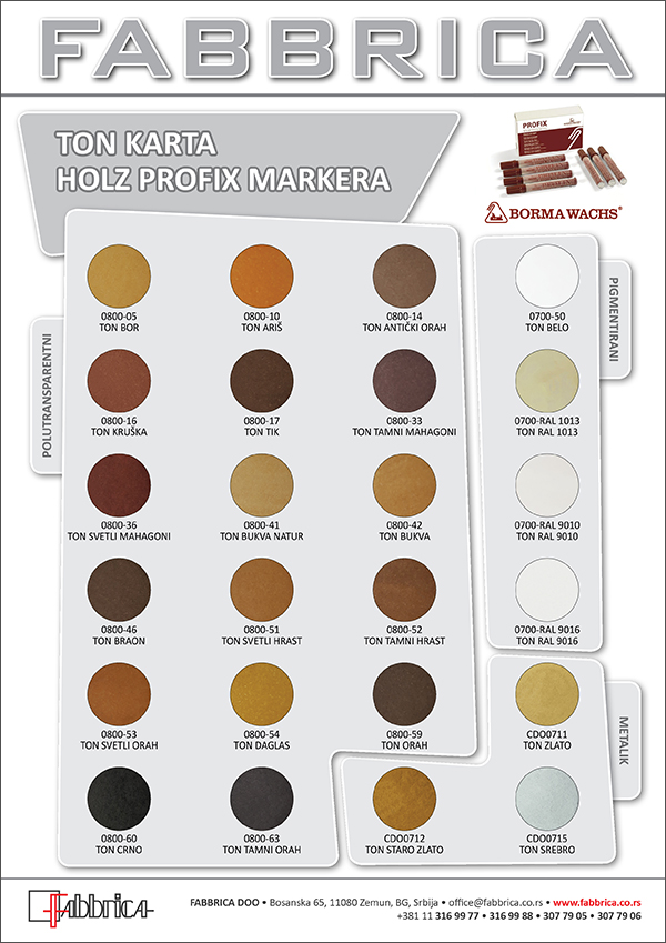 Tehnički servis Fabbrica doo redovno prati i analizira aktuelne tržišne zahteve u segmentu površinske obrade i dekoracije elemenata u enterijeru. Zbog velikog interesovanja komitenata za različitim materijalima koji se koriste za reparacije i restauracije lakiranih površina, za potrebe tržišta pripremljena je nova paleta tonova Holz markera.