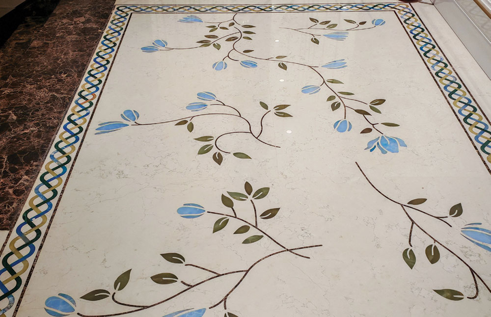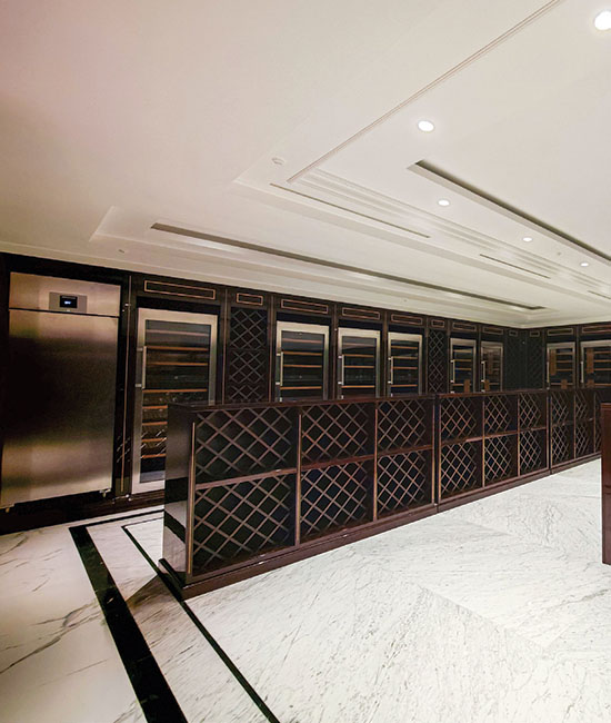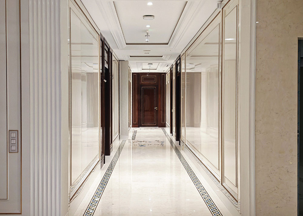 Podovi su postavljeni od kamena visokog kvaliteta, poliranog do visokog sjaja, dok su svi ugradni elementi – nameštaj, vrata i kuhinje – rađeni od američkog oraha, u kombinaciji sa furniranim i masivnim elementima, brušenim mesingom i završnim lakiranjem u visoki sjaj. Keramičke obloge, mozaici, zidne tehnike i spušteni plafoni deo su naših pažljivo izvedenih radova.